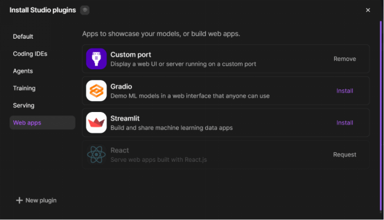 要添加新插件,点击“+”按钮,并从IDE、AI Agents、Training、Serving和Webapps插件中选择。
