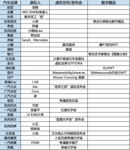 而《元宇宙日爆》统计,截至2022年底,有37家在华汽车品牌进行了元宇宙布局,其中19个品牌发布了虚拟数字人,5家品牌发行了NFT,举办虚拟发布会、建立元宇宙空间的共有15家。