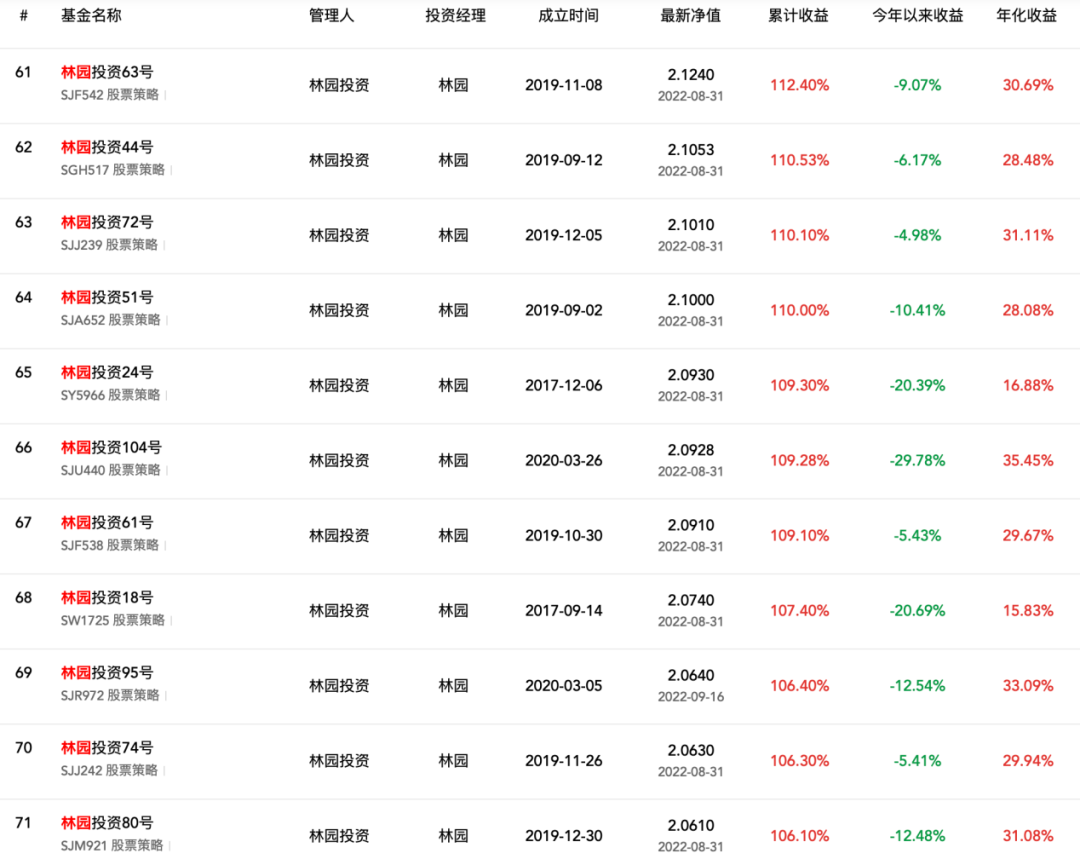 但林园其他年份基金的表现就完全不同。2019、2020年成立的一系列基金至今大多数都是正收益,并且不缺乏50%+、100%+的收益率水平——这还是在2022年经过较大规模回撤后的数字。