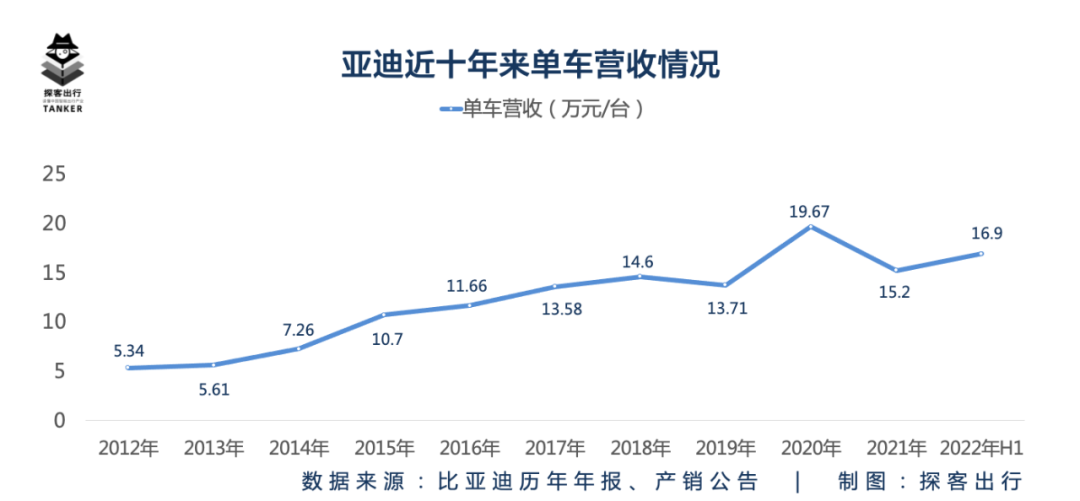 「探客出行」整理比亚迪近十年来的营收和销量数据发现,比亚迪在2012年的单车营收(汽车业务营收/汽车销量)约5.34万元/台,到2022年上半年上升至了16.90万元/台,十年间单车营收上涨了超3倍。
