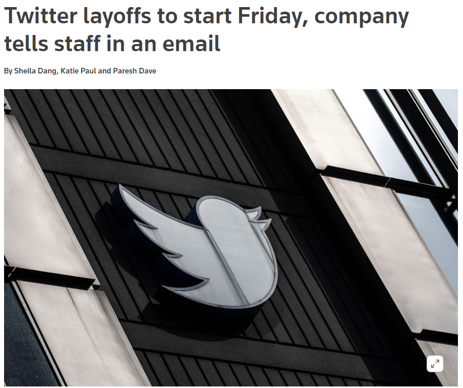 根据内部消息和一位投资者说法,**推特将裁员近50%,不过最终数字尚未确认。推特在邮件中称,裁员旨在让公司走上健康的发展道路。推特还称,其办公室将暂时关闭,所有的胸牌将暂停发放**,以“帮助确保每个员工以及推特系统和客户数据的安全”。