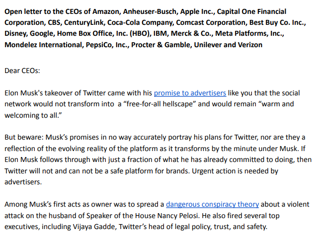 周二,40多个民权组织向推特的20家顶级广告商发出了一封公开信,敦促他们如果发现马斯克抛弃了该平台的内容审核保障措施,就暂停在推特上的广告。这封信由“自由新闻”和“美国媒体事务”等机构组织,由GLAAD和naacp等组织签署,寄给了苹果、谷歌、亚马逊、CBS、可口可乐、迪士尼、亿滋国际和宝洁等公司的CEO。