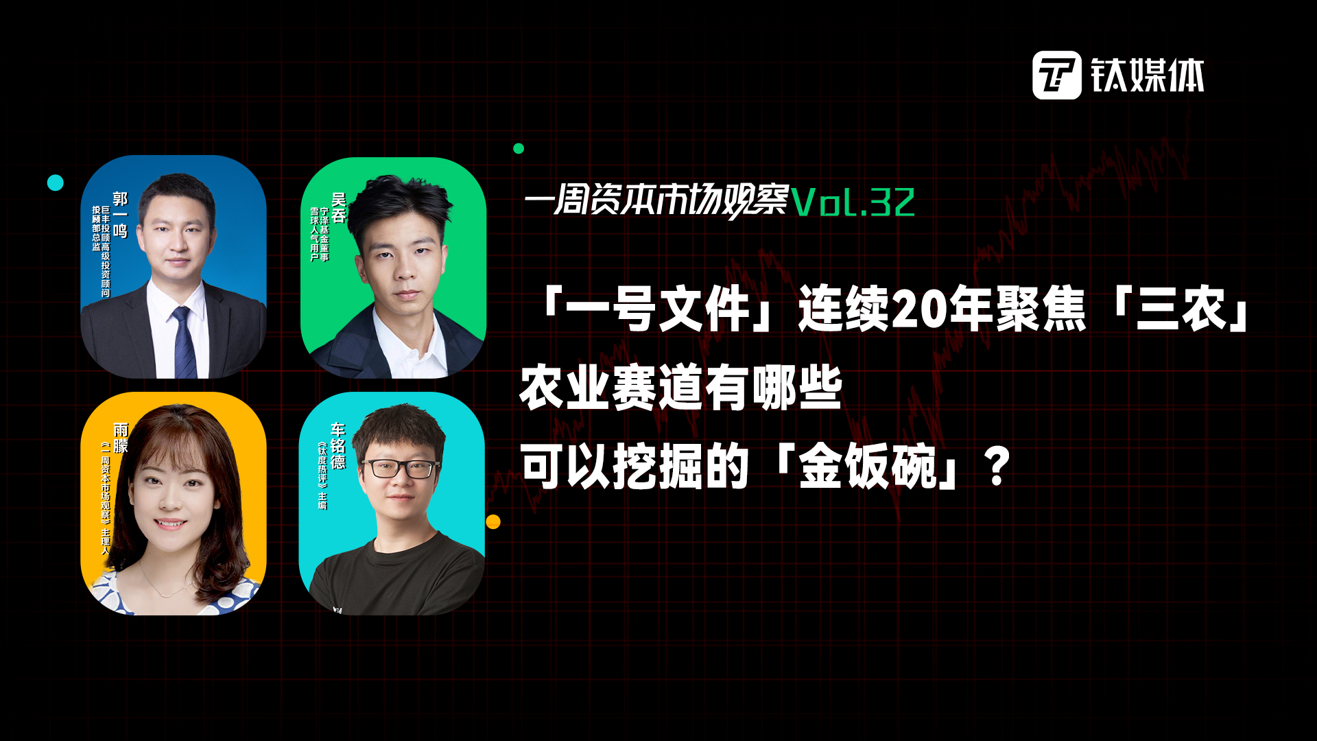 本期节目,《一周资本市场观察》主理人雨朦对话巨丰投顾高级投资顾问、投顾部总监郭一鸣(执业证书编号:A0680612120002),《钛度热评》主编车铭德,宁泽基金董事、雪球人气用户吴吞,分享了上周A股行情波动的原因;农业作为第一产业在国民经济中有哪些重要作用及面临的核心问题;哪些具体行业将受益于农村基建建设;预制菜行业如何助力农业发展;如何理解“融合农文旅”;1月社融数据有哪些关键信息;“不老神药”NMN被受理成为食品添加剂新品种;宁德时代推出“锂矿返利”计划;共享办公巨头WeWork最新业绩;周黑鸭发布盈利警告等话题。