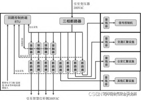 综合机箱内部供电设计如图 2 所示,综合机箱 采用5仓体设计,分为综合配电仓、信号机控制仓、交通汇聚设施仓、公安汇聚设施仓、其他汇聚设施仓; 变压器二次侧引入380VAC 至综合机箱内综合配电仓体的三相断路器总闸,由三相断路器总闸分别引至交流接触器和断路器 ,交流接触器用以控制 回路供电通断,断路器用以控制回路过载保护及手动通断,断路器一部分回路通过电缆引至每根智慧 灯杆给杆体挂载设备供电, 另一部分引至其他汇聚 仓体给仓体内汇聚设备供电。