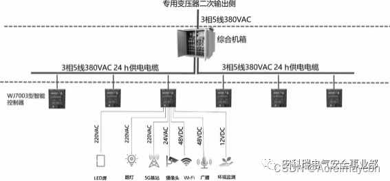 供电系统整体架构如图1所示 ,分为变压器至综合机箱、综合机箱至灯杆、灯杆至设备三层供电结构。从专用变压器二次输出侧引入一路380VAC供电电缆至综合机箱,综合机箱根据需要的供电回路方向和数量 ,分别引出380VAC 24 h 供电缆至每个内安装的智慧灯杆智能控制器 ,智能控制器输出220VAC 、24VAC 、48VDC 、12VDC 、5VDC 不 同 电 压等级回路供给杆体上挂载各类设备。
