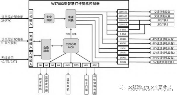 近年来不少智慧路灯项目主要从完成任务角度来实施,对关键技术问题缺乏通盘考虑,导致电气设计考虑不周全,供电通信配套不完善等技术痛点。常见问题如下:(1) 缺乏统一供电规划。当前智慧路灯供电设计多数采用传统路灯建设供电设计模式,结合建设时安装设施设备的供电需求进行设计,未考虑智慧路灯作为未来城市智能化设施重要载体的扩展需求,对预留供电冗余及如何根据需要拓展需求缺乏考虑。(2) 无法对不同主体进行单独计量。与传统路灯相比,智慧灯杆集成不同用户的设备,这些设备有市政用电、工业用电、商业用电,隶属于不同管理部门,无法单独计量,常见的通过供电线路进行区分,根据用户不同铺设不同供电线缆,将造成大量资源浪费,成本较高.(3) 缺乏供电统一保护问题。智慧灯杆集成大量设备,用电防护等级层次不齐,这些设备若接在电缆上,一旦发生雷击,会造成大量设备故障; 同时,一个设备故障短路或者漏电时,会影响整个线路供电安全,供电的安全防护需要统一考虑。(4) 缺乏远程管理手段。智慧灯杆集成大量设备,并不是所有设备都需要24h供电,像LED大屏在深夜无人时需要关闭,灯具白天需要关闭,亮化灯具在重大节日时才需开启,针对这些设备的供电缺乏远程管理手段。(5) 缺少对供电环境的动态监测。无论是供电箱体侧或者是杆体侧,要保障供电正常运行需要一个安全稳定的环境。目前供电系统设计多以箱体环境监测为主,缺乏对杆体如倾斜、内部温湿度、积水、震动等环境状态的监控。