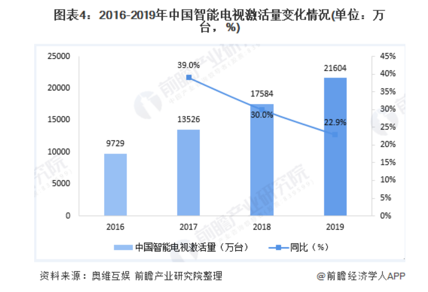 经过数年的发展后,网络连接技术成熟,智能家电也迎来爆发。奥维云网的数据就显示,2016-2019年期间智能电视出货量、激活量开始快速增长,激活量年均复合增长率超过25%,从9729万台增长至21604万台。