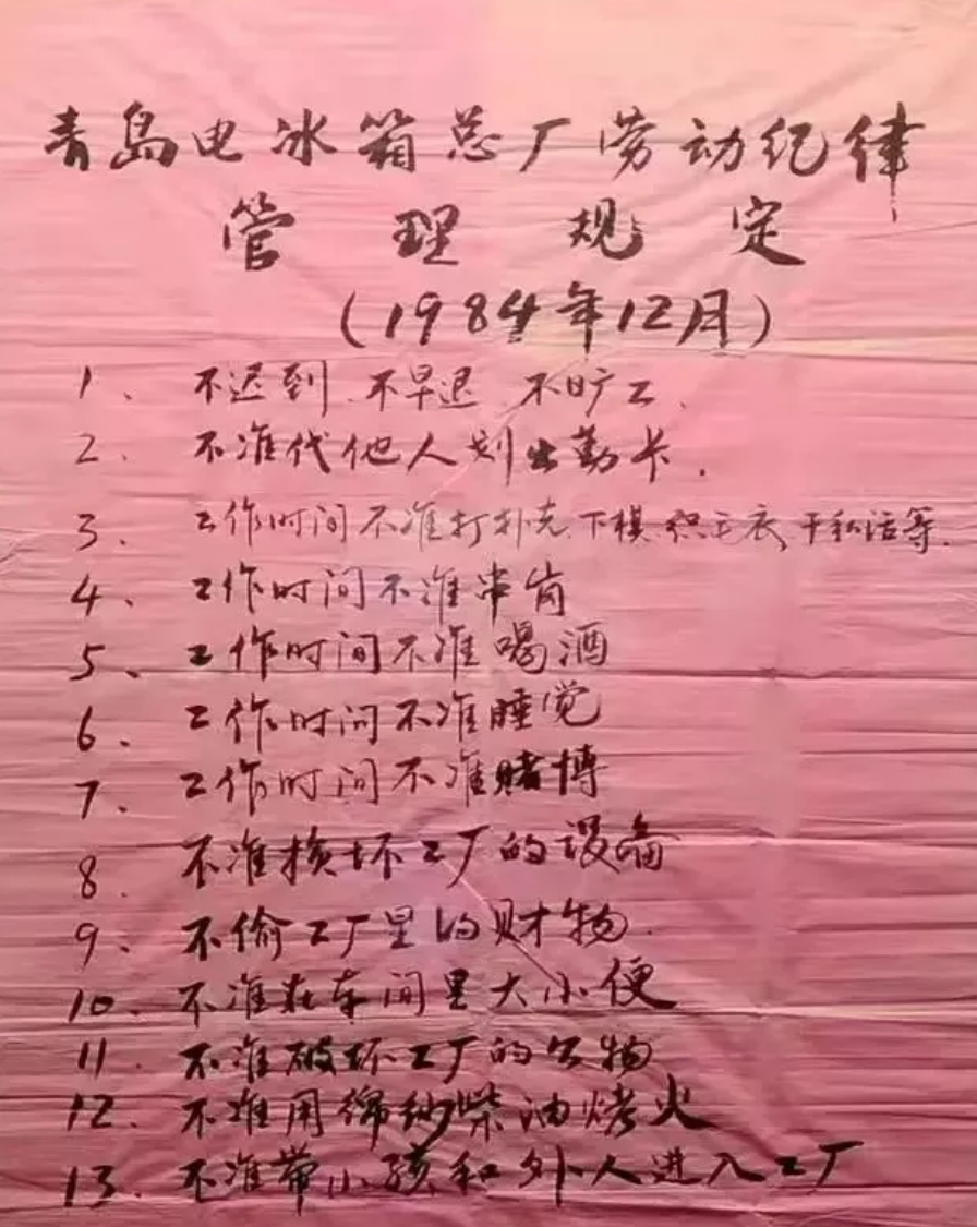 铁腕治军的张瑞敏,第一时间拿出了日后被媒体、网民反复传颂的“十三条军规”。如果说工作时间禁止睡觉、喝酒、串岗,不准损坏工厂设备等规定还算正常的话,那么“不准在车间随地大小便”这种看似奇葩的规定,则侧面反映了当时的工厂管理已经混乱到何种地步。