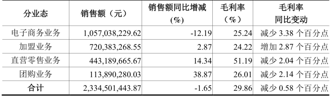 而良品铺子的渠道分布相对平衡。根据其第三季度报表显示,主要经营数据公告显示,电子商务业务实现销售额10亿元,同比下滑12.19%;加盟业务、直营零售业务以及团购业务等三项线下业务实现收入12.77亿元,同比增长9.19%。