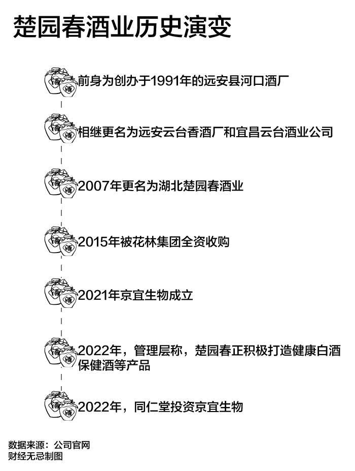 楚园春酒业可谓命途多舛,此前曾多次经历改名与易主。据财经无忌梳理,楚园春前身为创办于1991年的远安县河口酒厂,后相继更名为远安云台香酒厂和宜昌云台酒业公司。2007年更名为湖北楚园春酒业,2015年被花林集团全资收购。