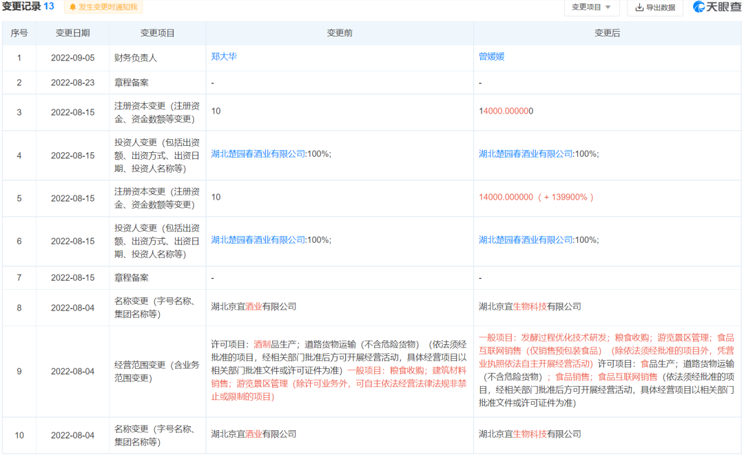 据“三峡晚报”报道,楚园春正积极打造健康白酒、保健酒等产品,子公司京宜生物在今年8月注册资本变更为1.4亿元,主营业务范围与财务负责人也相继更新。