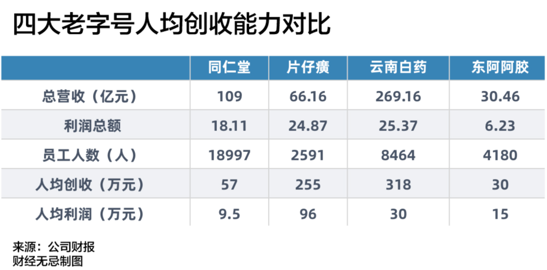 其次,同仁堂的运营能力也有待加强。对比东阿阿胶、片仔癀以及云南白药的人均创收能力,同仁堂均垫底,或面临着人员臃肿的问题。