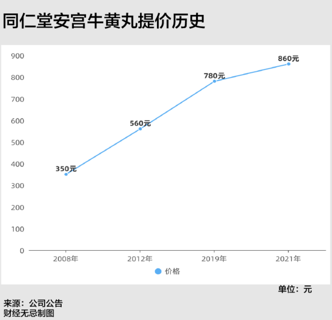 由于同仁堂在安宫牛黄丸上具备足够的龙头优势,其20多年来一共提价过三次,终端价格从145元提高至860元,对比阿胶与片仔癀的提价幅度,略显温和,因此带动了销量的增长。