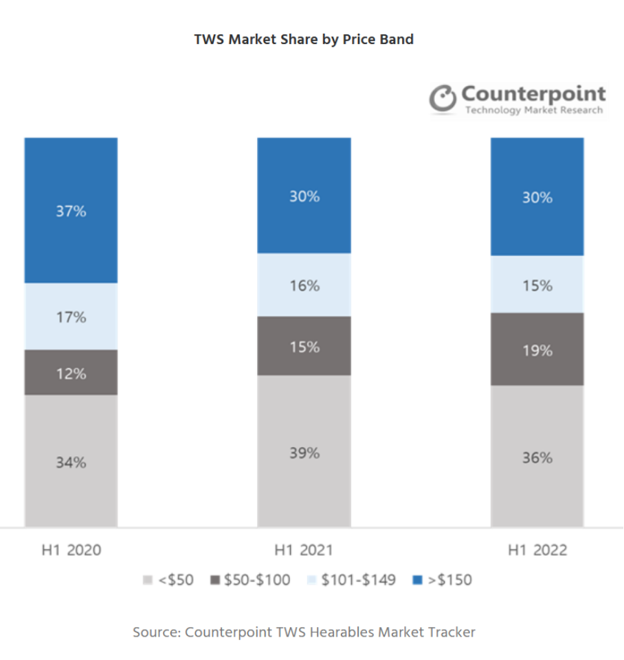 但是,以苹果、三星为首的高端TWS销量增长已经出现停滞,甚至可能会下降。未来TWS的市场增长潜力将聚焦在50-100美金的中低端价格。此趋势已经在22年H1中有所凸显。