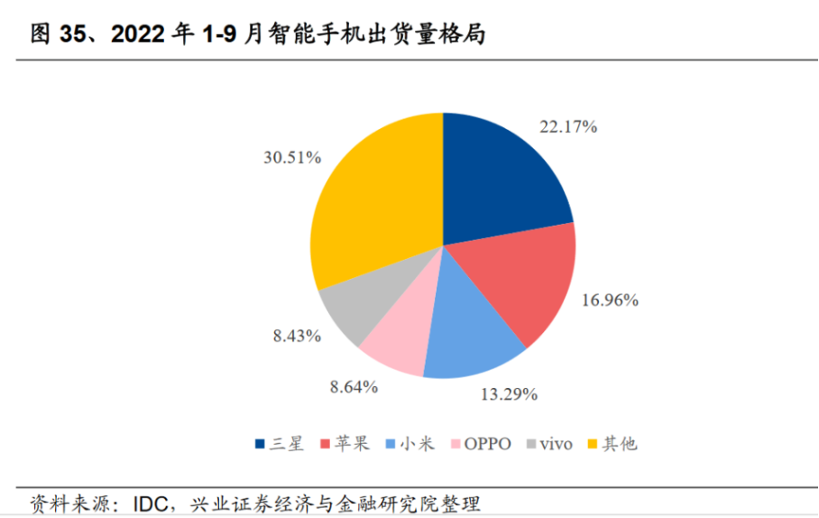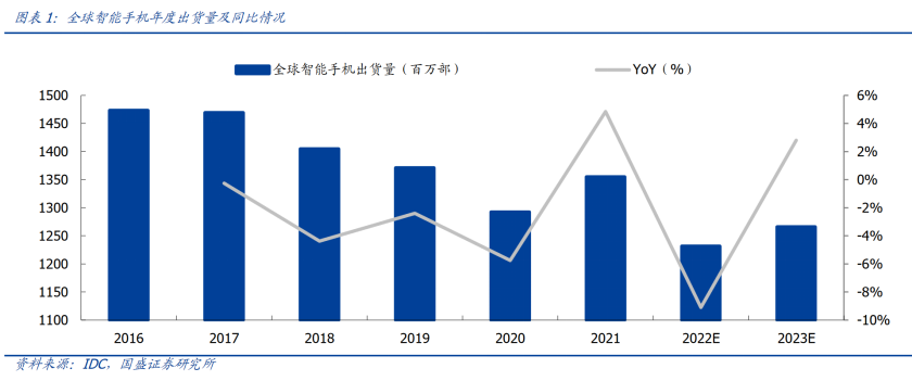 根据 IDC预计 2023 年随着全球疫情影响缓解,及全球消费能力恢复,将在 2023 年出货量同比增长 2.8%,出货量总量约 12.6-12.7 亿部。