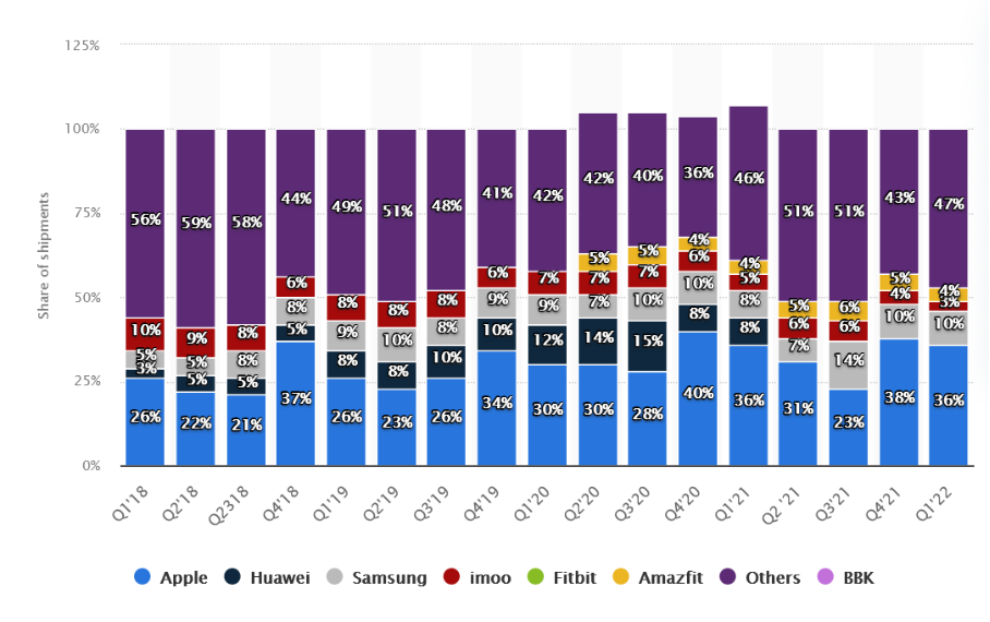 在市场份额上,Apple Watch仍是主力消费,毕竟手表可归属于手机的周边产品,需要系统匹配,所以Apple Watch的销量会关联iphone的存量用户和部分新增用户。