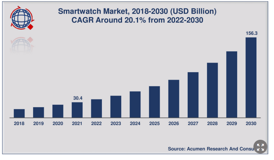 根据Acumen Research and Consulting 的预测:2023年全球智能手表市场规模仍呈现增长势头,并且该趋势将延续到2030年,预计2018-20230年复合增长率为20.1%;2021-2028年复合增长率为10.2%。23年的市场规模约55million。