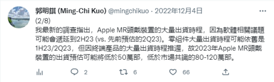 根据苹果分析师郭明錤的预测,备受瞩目的MR头显,可能会再次延期发布,原定于23Q2的时间或推至23H2。23年MR的出货量或低于50万部,远低于市场预测的80-120万部。