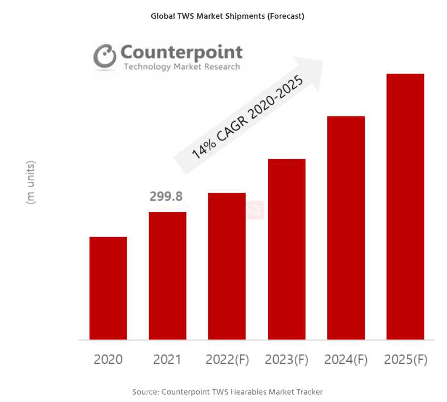 根据Counterpoint预测显示,未来几年TWS耳机的销量仍旧是处于增长的趋势当中。