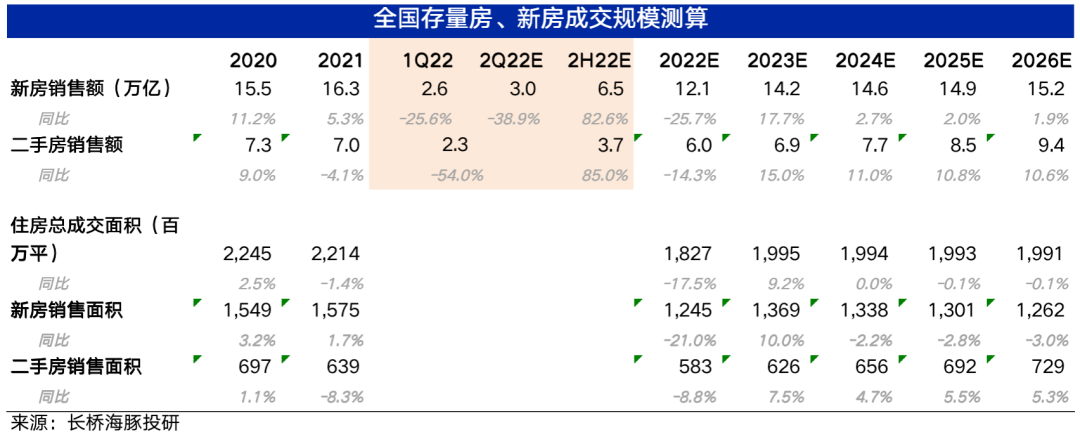 基于以上对楼市短期和长期的判据,我们乐观假设22年下半年,新房和存量房交易金额暴力反弹(同比增长80%以上),到2023年市场企稳,一二手住房总体交易金额规模将回升到21万亿左右,之后就回归到成交面积缓慢下降的趋势中,详细预测如下。