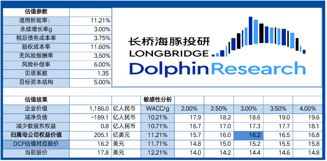 基于以上相对乐观的预测,海豚君通过DCF模型测算出贝壳当期的合理股价在$16.2,因此虽然楼市有很强的复苏预期,我们认为贝壳最高$19,当前$17.8的股价已经透支了回暖的预期。