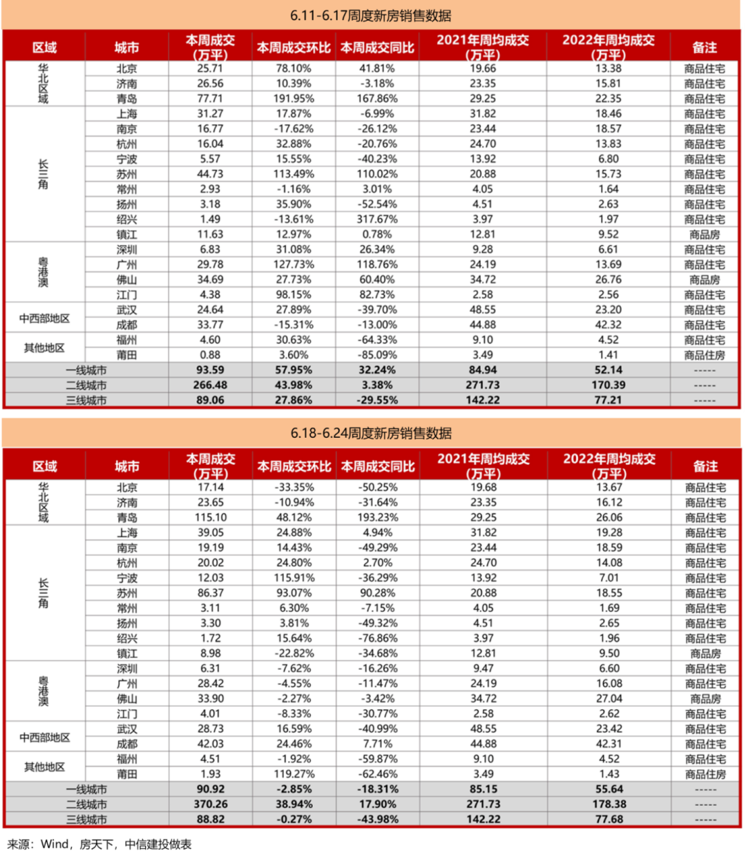1)2021年6月同期是端午节,因此市场曾担忧近两周同比暴增有往期低基数的原因。但略过同比表现,只看成交绝对额就能发现近两周一二线城市的新房成交面积已超过21年6月周均及21年全年周均成交量,因此近期楼市的反弹是实打实的,而不仅仅是低基数的原因。