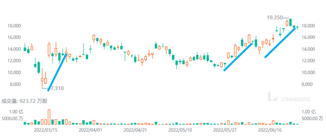 具体来看的话,**贝壳股价的拉升主要有3次,**一是3月中旬市场在中概退市风险下极度悲观情绪反转后的超跌反弹;二是5月底上海宣布解封后,楼盘交易能够重启,市场预期提前转暖;三是在6月中旬部分城市楼市实际成交数据大幅改善后,市场预期开始兑现。