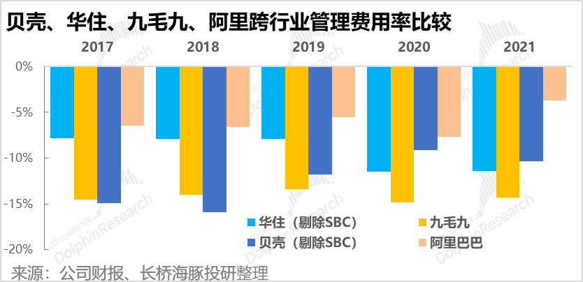 由于营销费用和研发费用本就占比不高,且即便缩减也释放不出多少利润。因此直观看来,贝壳的利润释放潜力主要还是取决于毛利率能否提升,以及高达10%以上的管理费用有多少压缩空间。