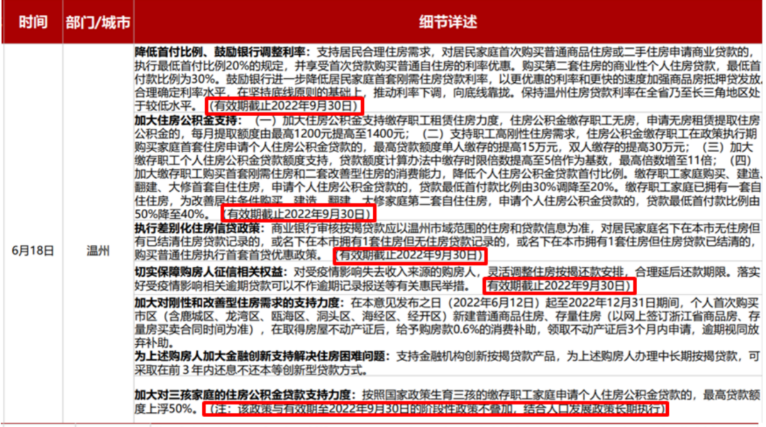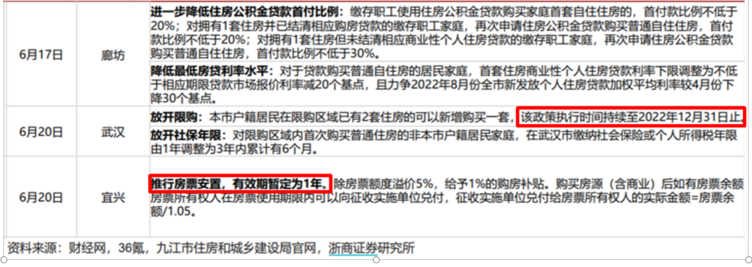 上述判断,其实从近期的政策中也可窥得一二。根据下图中整理的房地产政策,可以发现一个与过往不同的特点:此轮放松政策当中相当一部分都设置了有效期限(红框处)。例如温州的房贷和公积金优惠政策仅持续到今年三季度末,武汉的限购松绑仅在年底前有效,宜兴的房票安置政策有效期仅一年。