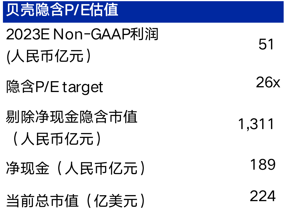 在DCF估值以外,由于贝壳的长期业绩有较大的不确定性,且当前市场情绪相对乐观,海豚君发现市场大多相对乐观的采用2023年Non-GAAP利润(加回了股权激励费用和无形资产摊销后)进行估值。根据海豚君的预测,23年贝壳Non-GAAP净利润约为51亿人民币,剔除净现金后,当前股价隐含的P/E估值在26x左右(我们预计22-25年利润CAGR为29%)这样来看的话,当前的估值还算合理。不过把公司需实际支出的激励费用忽略不计是否合理,只能说见仁见智了。而我们预计公司23年GAAP口径净利润为35亿元,当前市值对应的隐含P/E倍数就高达37x了。