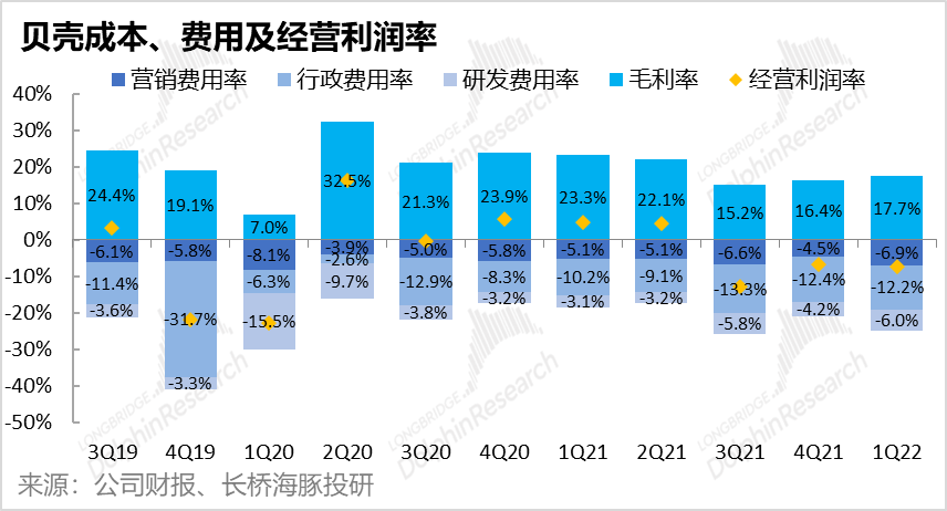 由上图可见,即便在行业景气时,贝壳的毛利润也仅20%出头,在扣除10%左右的管理费用率,以及分别在5%左右的销售费用和研发费用后,便仅能剩下个位数的利润率。
