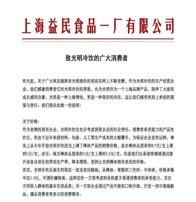 上海光明旗下的益民食品一厂曾在2018年发过一则公告,公告透露了部分商品涨价的秘密。公告称,由于旗下光明牌冷饮17年不涨价,渠道受阻正面临断供危机。