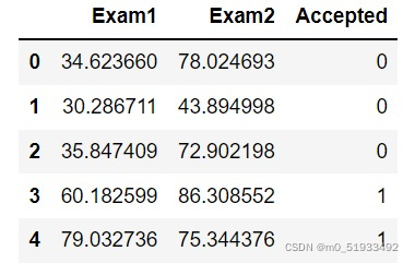data = pd.read_csv(path, names=['Exam1', 'Exam2', 'Accepted'])#读取数据