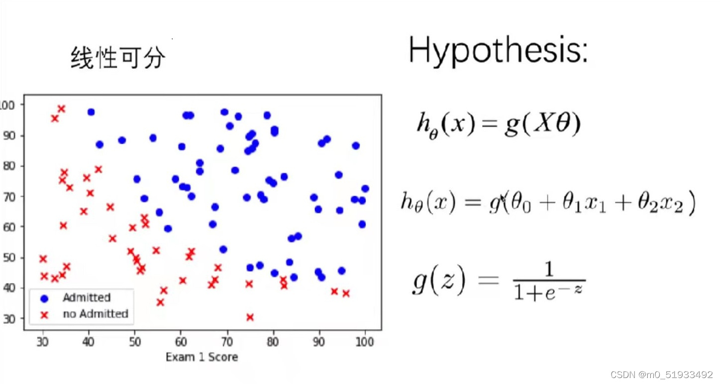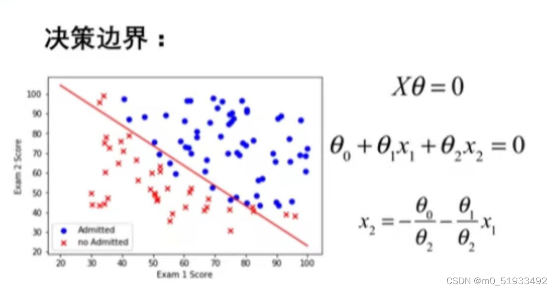 预测一个学生是否被大学录取。假设你是大学某个院系的管理员,你想通过申请人在两门考试中的表现来决定每个人的录取率,你有来自以前申请人的历史数据,你可以用这些数据作为训练集建立Logistic回归,对每一个训练样本,你有申请人在两门考试中的分数和录取决定。