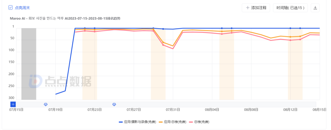 「Maroo AI」韩国 iOS 下载榜 7.19-8.15 日排名变化|来源:点点数据