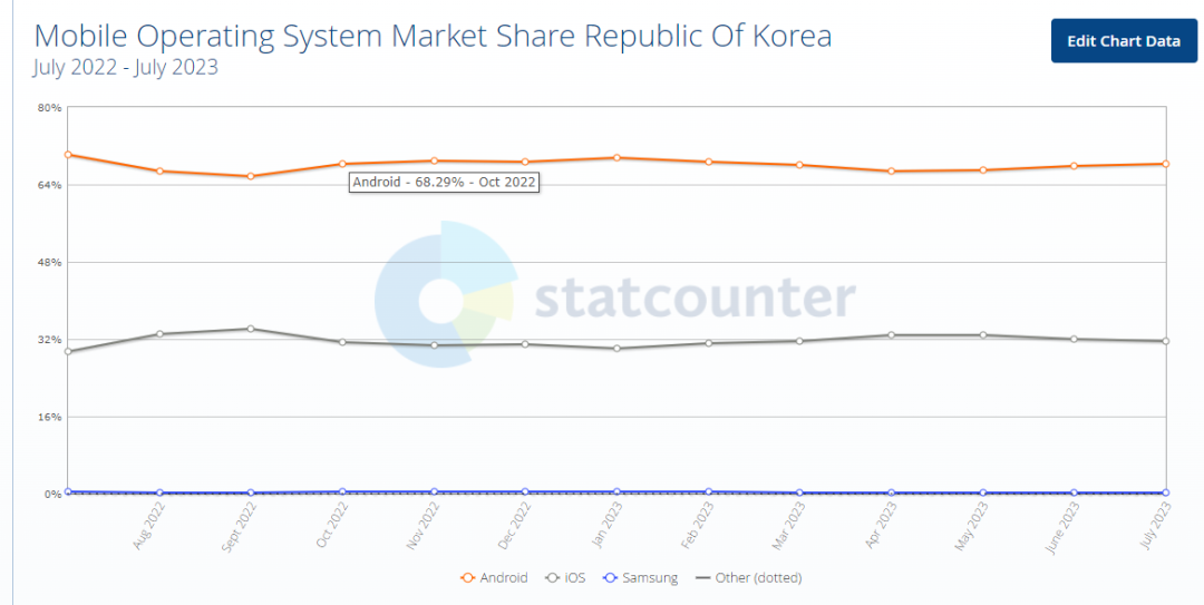 不过具体去看下载量绝对值时,会发现并不高,在韩国使用苹果手机的用户数量有限。根据 statcounter 最新统计,2023 年 iOS 在韩国移动操作系统的占比为 31.49%。