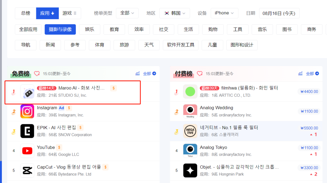 Maroo AI 6 月 15 日上线,7 月 21 日出现在榜单后,始终保持在韩国 iOS 下载榜 Top100,在摄影&录像分榜霸榜 15 天。