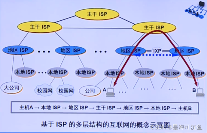 假如A是北京东城区的,给B发送一个数据。发给东城区的服务商,服务商看是不是自己的服务器,或者是不是自己的电脑,如果是,那就传过去了,不需要经过上级;如果不是,就会往上传一级给城市(北京)。北京的ISP再看看数据是不是发给北京的,是北京的,就在转下去;如果不是北京的,就继续往上传给国家。然后国家在进行判断,是往上传还是往下传,......,就这样,一直传给B。