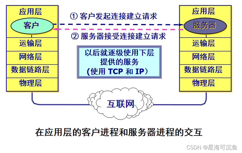 应用层:可以理解为某一个应用程序 应用的进程,需要访问网络。比如说 QQ,QQ的进程想要访问网络,向计算机提出一些访问网络的请求,这就是应用层的功能。