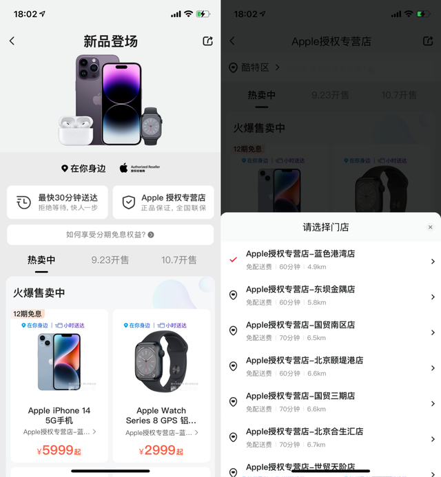 早在 9 月 8 日苹果发布会后,美团紧跟着就发布了“买 iPhone 14 现货最快半小时可送达”的公告,并且相比去年 iPhone 13 系列现货一小时可送达,美团此次覆盖的苹果授权专营店数量增长超过一倍至 1100 家,还增加了“12 期免息”服务。
