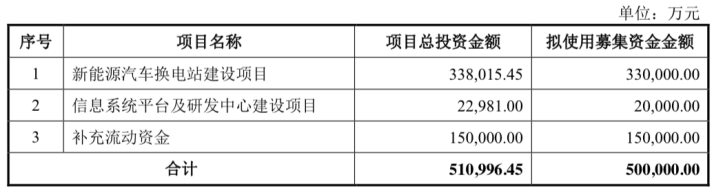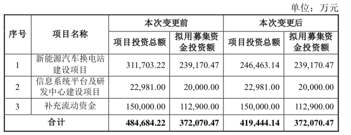 不过,协鑫能科前次募资投向的新能源换电站项目不仅投资金额下调,换电站数量减少,还将延期完成。公告显示,协鑫能科最初计划在江苏、广东、广西、新疆等地区建485个换电站,其中乘用车换电站300个,重卡车换电站185个,同时引进相关辅助配套设施。项目总投资33.80亿元,拟使用募集资金33亿元。