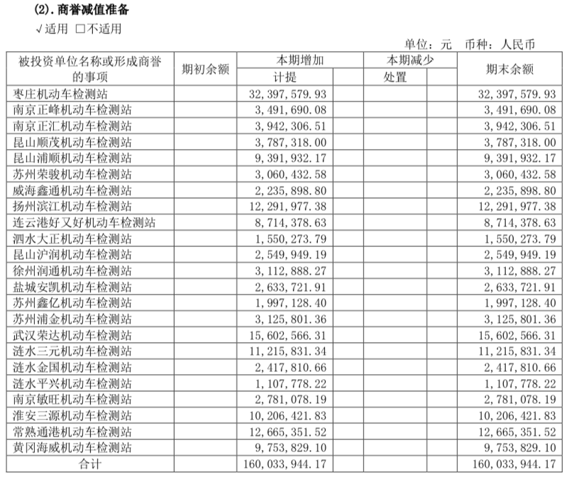 收购来的车检站拖累了业绩。到年底时,公司不得不计提大量商誉减值,2021年商誉减值总额达1.6亿元,涉及23家车检站。其中,约半数全额计提,8家为2021年收购、合计减值0.56亿元。公司计提减值如同公司并购时一样“激进”。