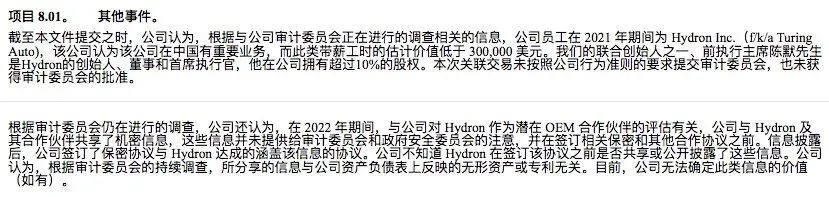 图森未来提交的8-K文件称,一些员工在2021年期间为联合创始人陈默创办的公司Hydron(该公司在中国有重要业务)进行了一些工作,同时,在2022年,还在评估Hydron是否可以作为潜在OEM合作伙伴期间,公司就已与其共享了机密信息,这些并未提前告知审计委员会和政府安全委员会。