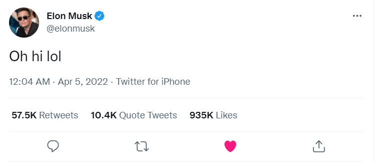 在众多国内外媒体把“马斯克成为推特最大股东”的消息竞相报道后,马斯克本人在其个人推特上只做出了这样的回应。**虽然这一回应很简单,但马斯克在推特上砸了几十亿美元。 **