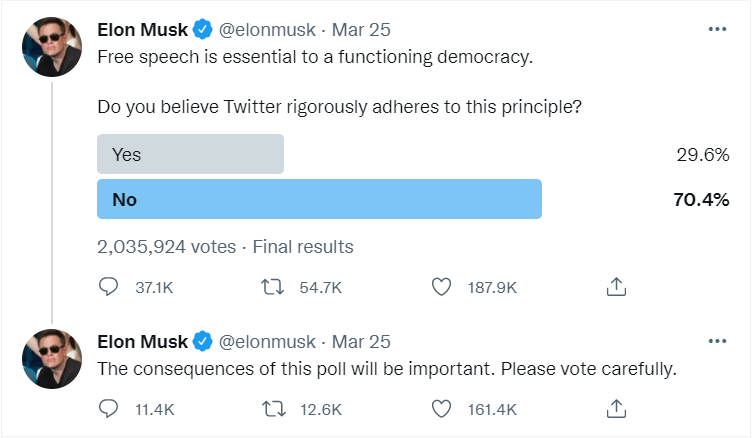 时间回到上月25日,马斯克在推特上发布了一项投票,内容是“你觉得推特有遵守言论自由(Free Speech)的原则吗?”他同时还提醒道“这个投票相当重要。请小心投下你的一票。”