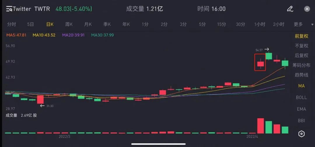 就在马斯克发出那条确认成为推特最大股东的推文后,据老虎证券数据显示当日推特股价涨幅一度达到了27.12%,收盘时股价达到49.97美元/股。这一涨幅也成为了推特自上市以来最大的单日涨幅。