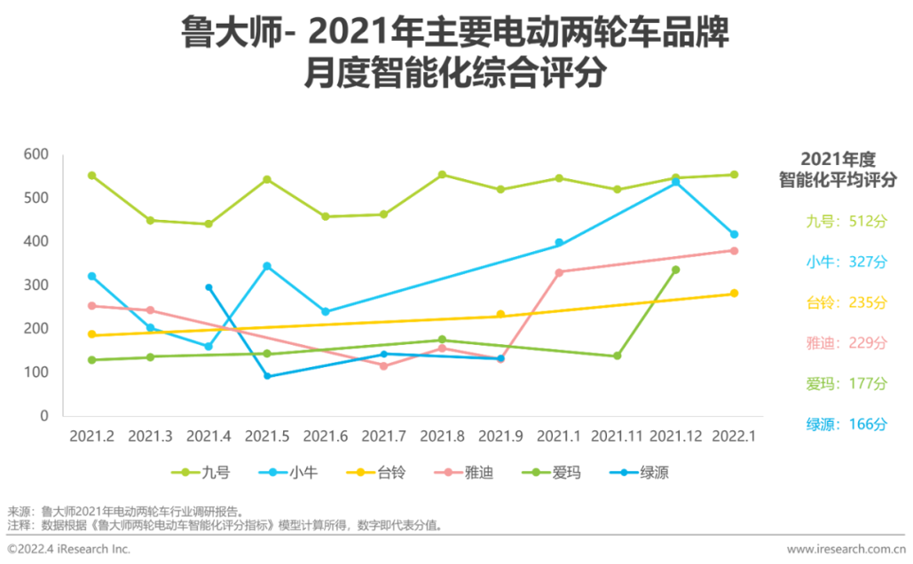 根据鲁大师2021年电动两轮车行业调研报告,九号、小牛的智能化评分在全年大多数月份领先于其他品牌,九号全年综合智能化评分水平最高。