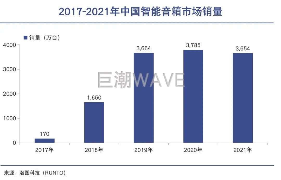 洛图科技数据显示,2017年-2019年国内智能音箱市场销量从170万台增长至3664万台,2018年、2019年的销量增速分别为823%和126%。整个赛道迎来了一轮爆发式增长,中国也迅速成长为全球最大的智能音箱市场。