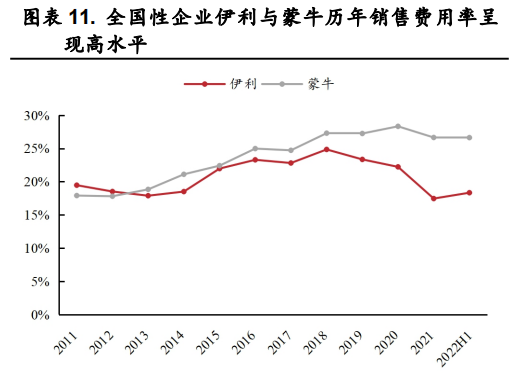 2011—2021年十年时间,伊利和蒙牛销售费用基本呈逐步上升趋势(2020年疫情以来伊利在销售费用投放上有所下降)。具体来看,2021年,伊利与蒙牛销售费用分别为193.15、234.88亿元,销售费率分别为17.46%、26.65%,呈现较高水平。