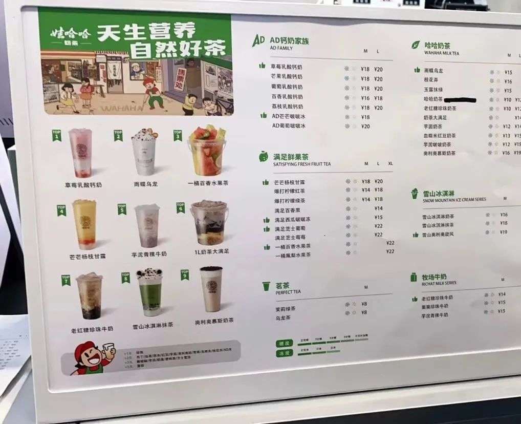 在娃哈哈奶茶店放出的20款产品中,价格大都在10-24元之间,人均客单价在18元左右,正好处在茶饮市场体量最大、竞争激烈的中端区间。